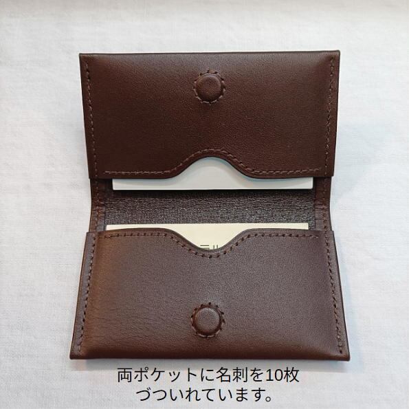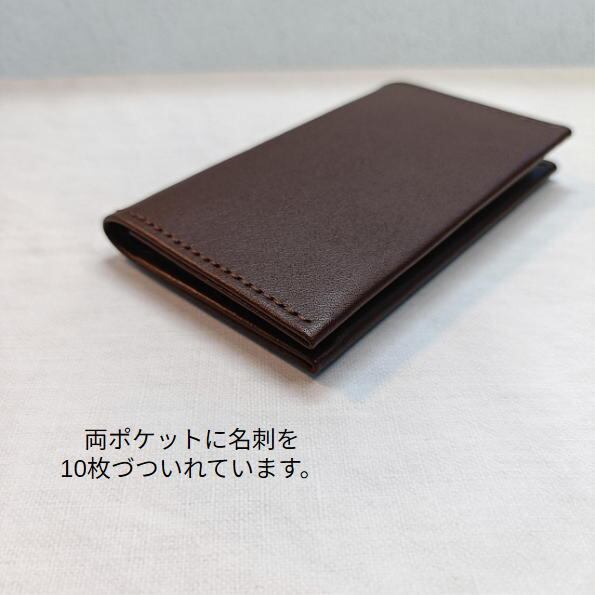 収納できる名刺枚数は、各ポケット10枚程度、計20枚を推奨します。名刺ありの画像ではそれぞれのポケットに10枚を入れて撮影しています。