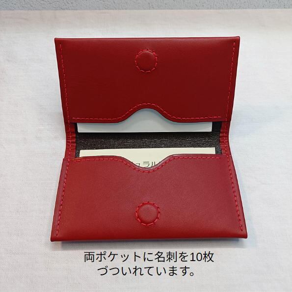 収納できる名刺枚数は、各ポケット10枚程度、計20枚を推奨します。名刺ありの画像ではそれぞれのポケットに10枚を入れて撮影しています。
