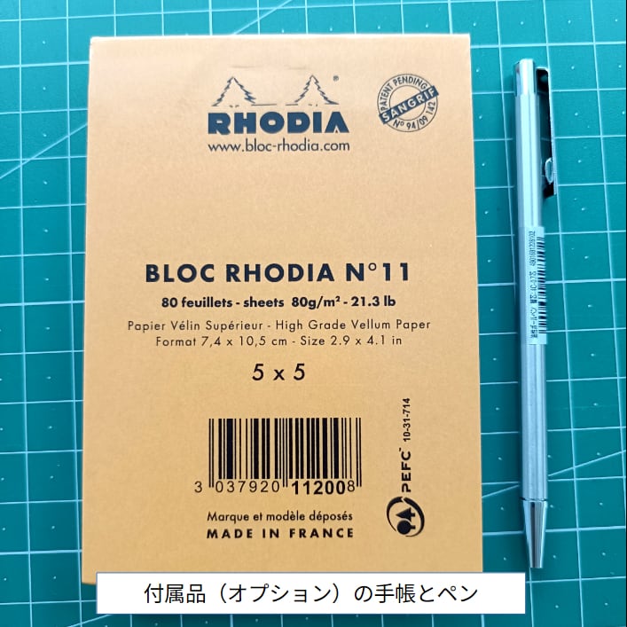 メモ帳本体とペンは商品に含みません。ロディアNo.11(方眼罫/オレンジ)と手帳用ミニボールペンをあらかじめセットすることができます(別売オプション)。
